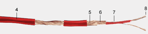 - 7. Aislante del conductor: PE, Ø 1.15 mm, blanco y rojo, par retorcido